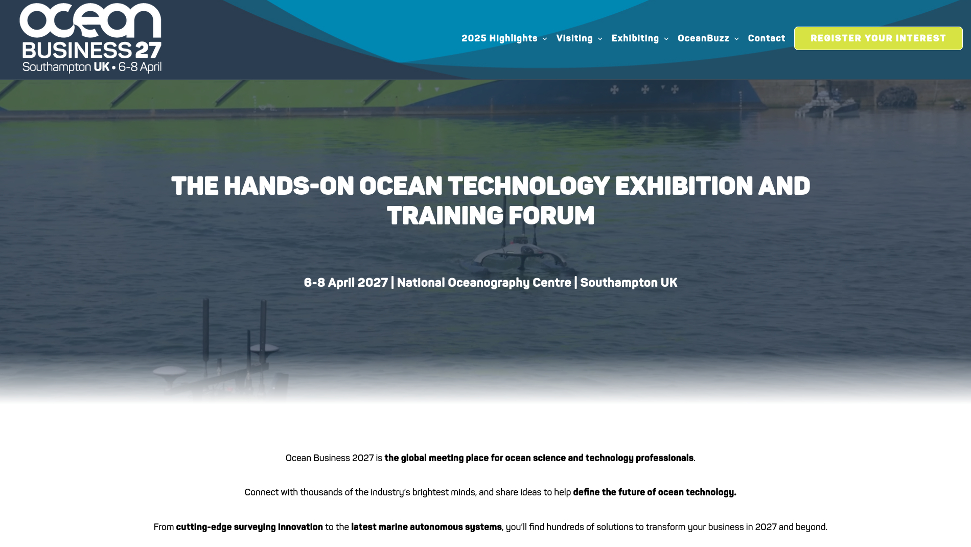 Ocean Business 2027 is the global meeting place for ocean science and technology professionals. Connect with thousands of the industry’s brightest minds, and share ideas to help define the future of ocean technology.